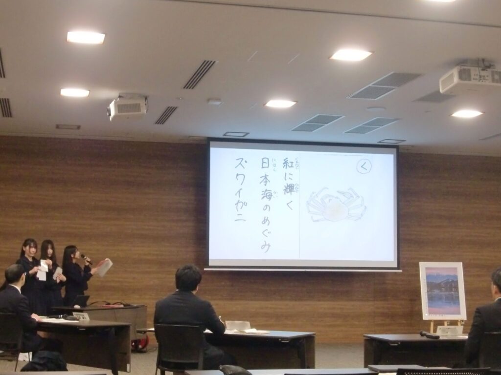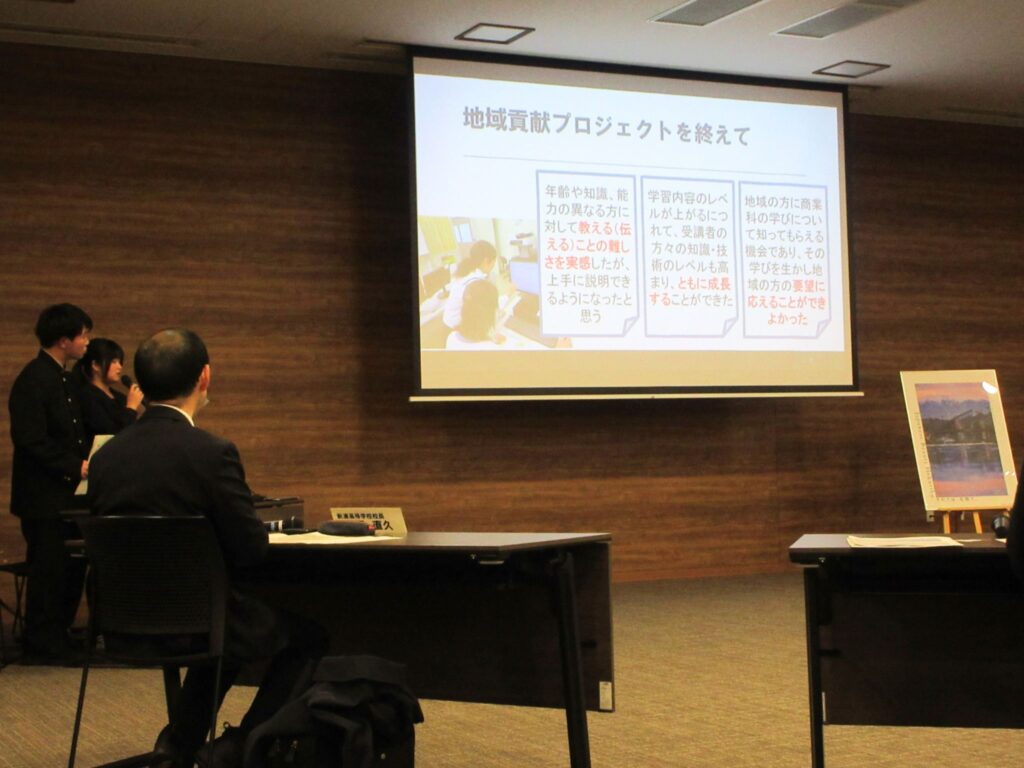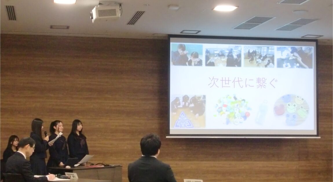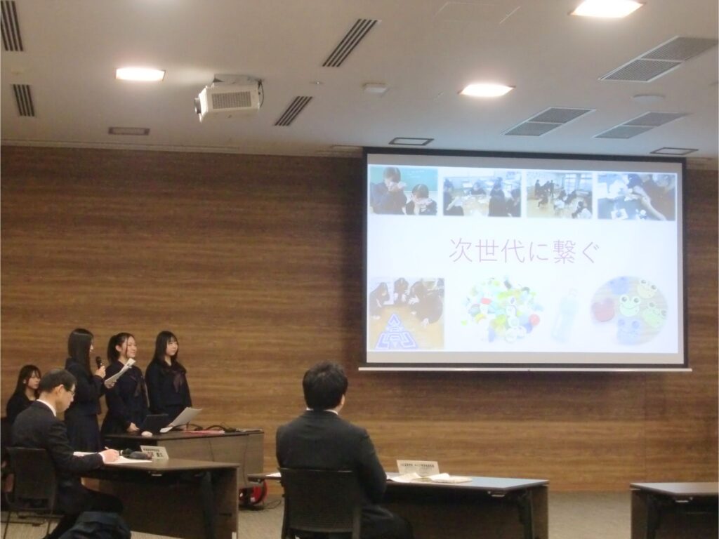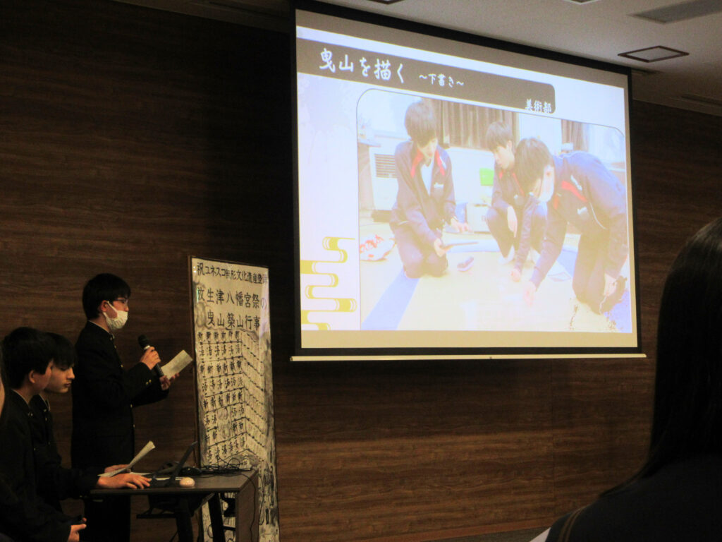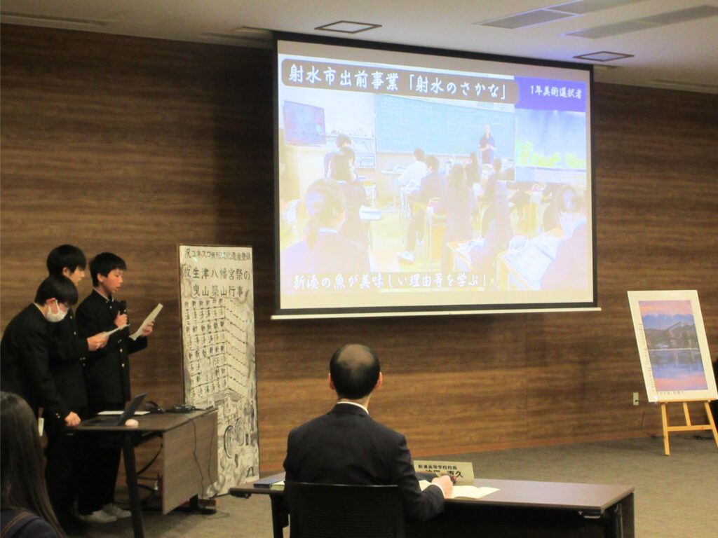 本校からは2学年普通科による「地域の課題を解決!」、商業科による「地域貢献プロジェクト~『地域のつながりを大切に』~」、1学年美術選択者・美術部員による「新湊を照らそう」といった取り組みを代表生徒が発表しました。