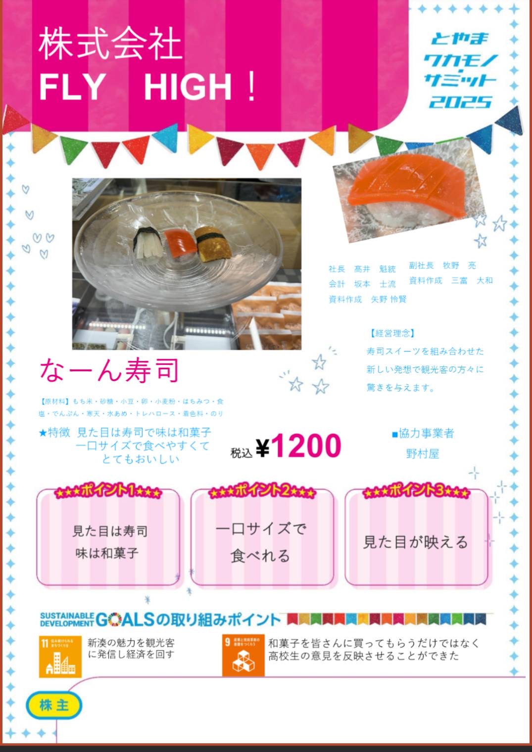 僕たちは、新湊高校商業科の2年生です。とやまワカモノサミット2025という企画で、地元企業の野村屋さんと連携して商品開発をしました。