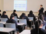 3月3日(水)、本校会議室で2年生商業科を対象に、令和2年度高大連携未来を拓く人材育成事業(特別授業)を行いました。射水市新湊地区にある海王丸パーク、新湊大橋、きときと市場などの観光資源を地域活性化につなげるためのビジネス戦略、及びマーケティングリサーチ、市場調査などの手法を研究し、地域の魅力を発信することにつなげ、また3年次の「課題研究」で実践することを目的として、富山国際大学現代社会学部 助重 雄久教授からお話をしていただきました。
