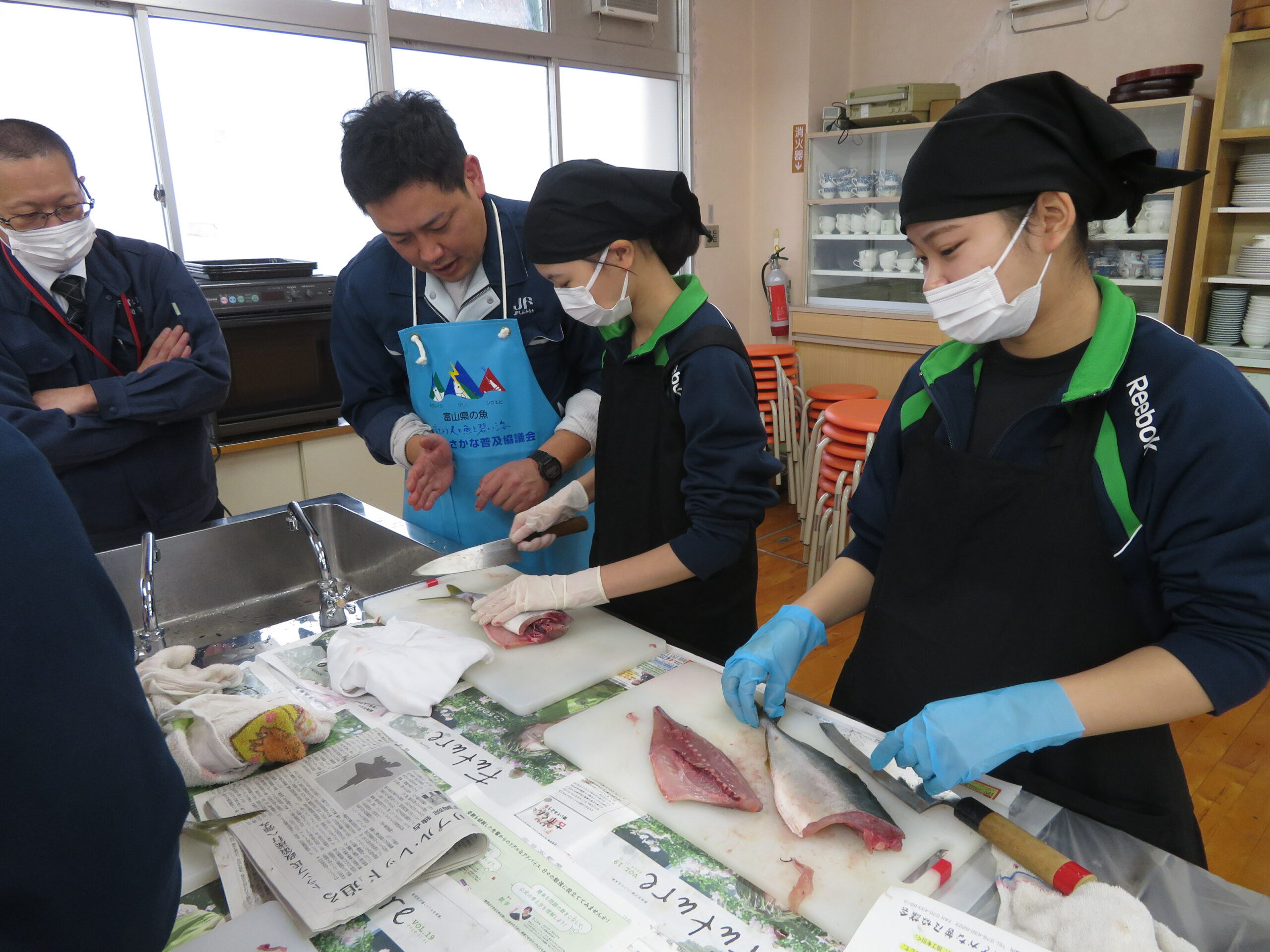 富山県漁業協同組合連合会、新湊漁協青年部・女性部より11名の講師をお招きし、地元でとれたふくらぎを3枚おろしにしたり、残を用いた汁物を作ったりしました。ご協力いただいた、講師の皆様、誠にありがとうございました。