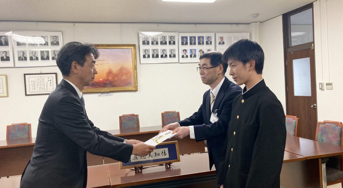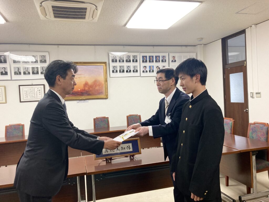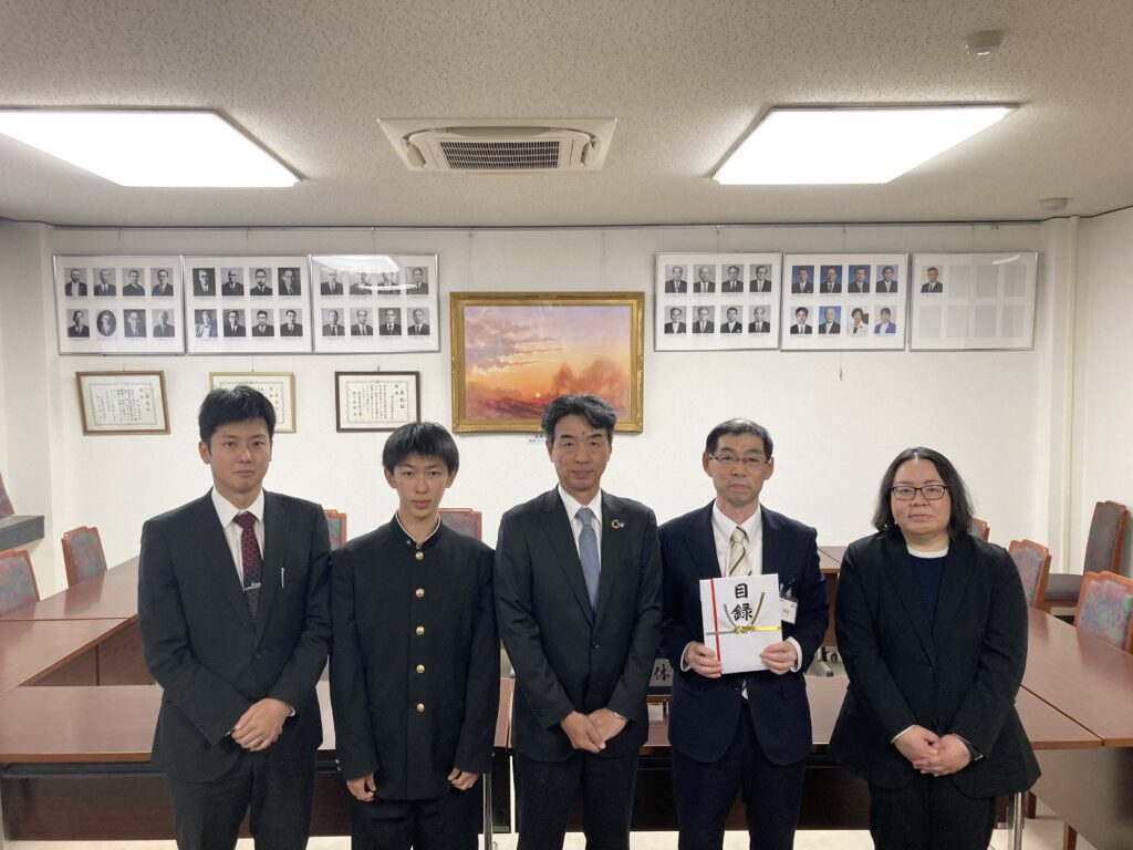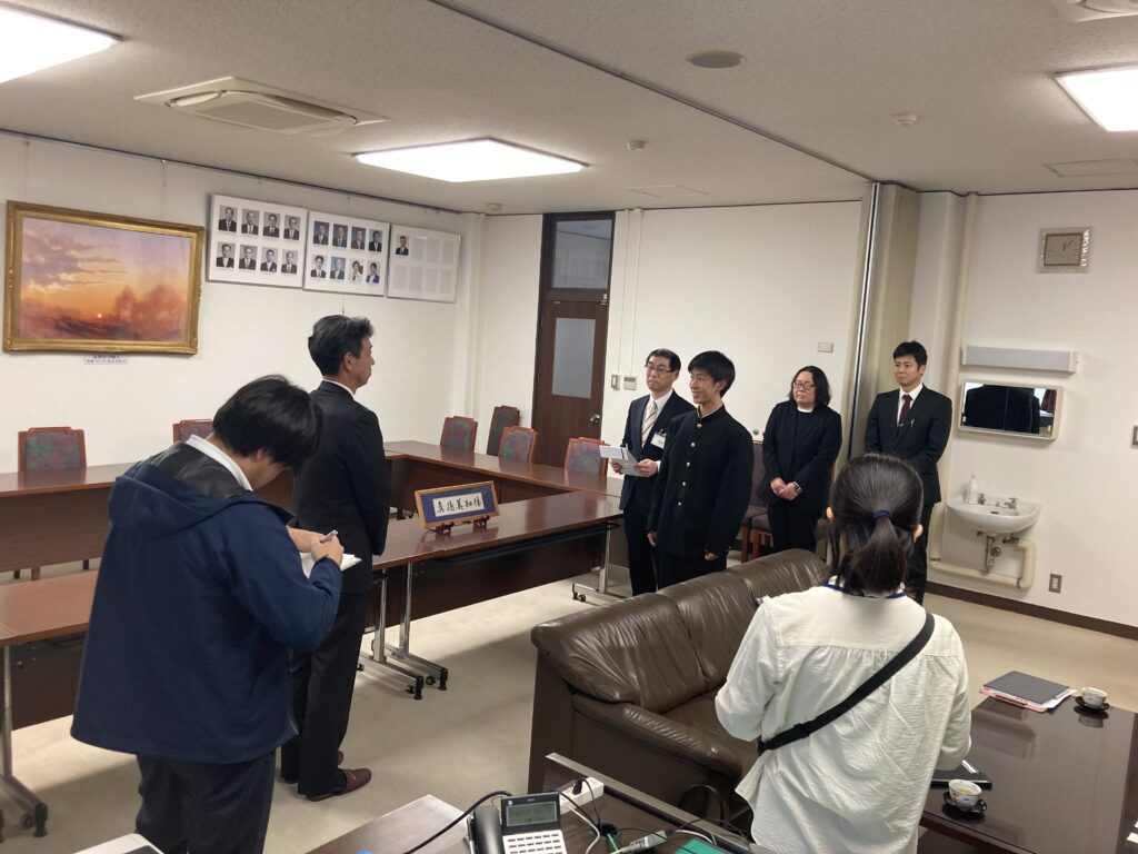 11月25日(火)に本校応接室にて、北陸銀行奨学助成財団より2学年商業科へ、アジア諸国との教育交流助成金が贈呈されました。 こちらの助成金は、12月3日(水)から12月6日(土)にかけての2学年商業科台湾修学旅行にて活用する予定です。
