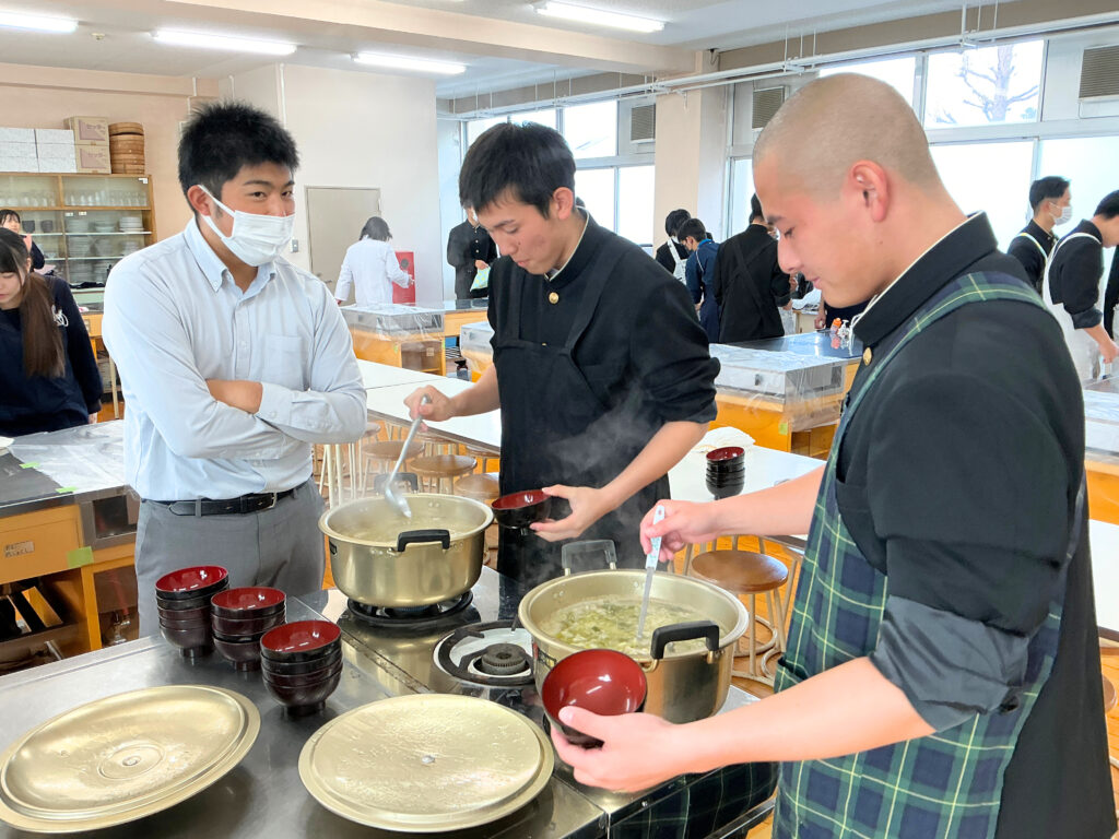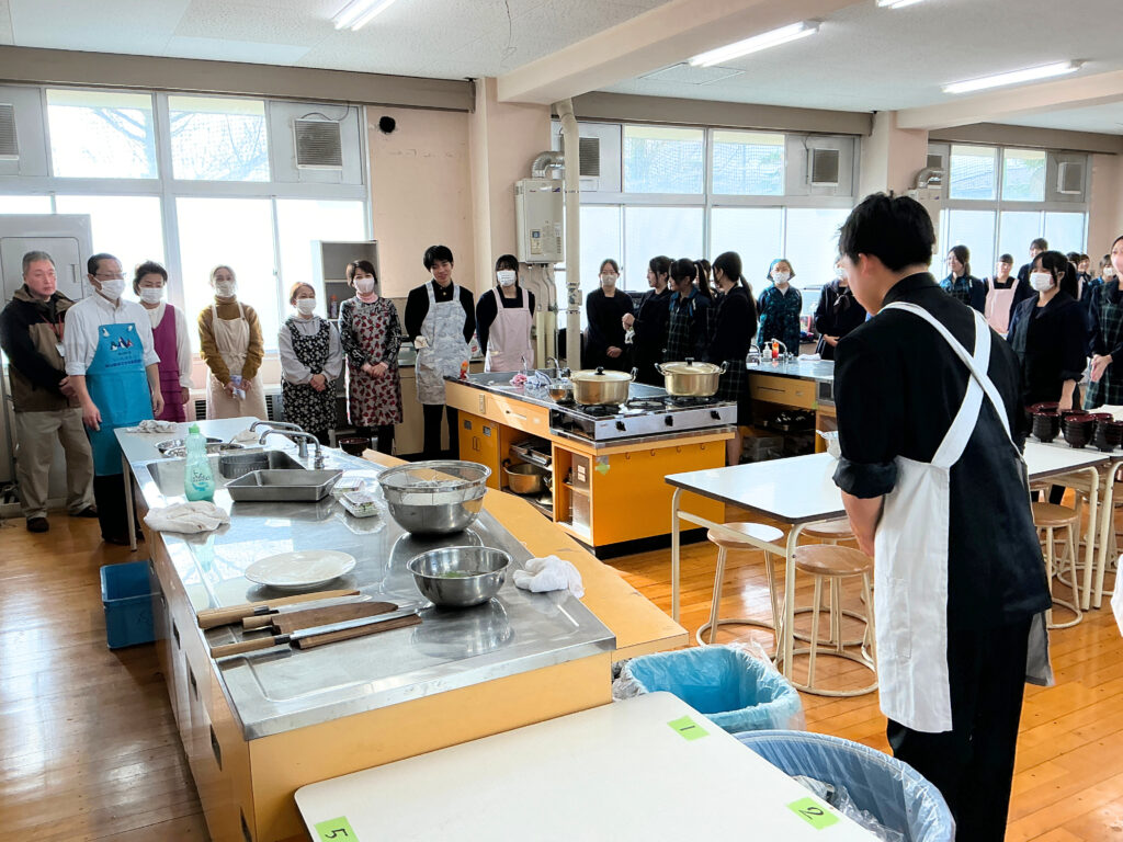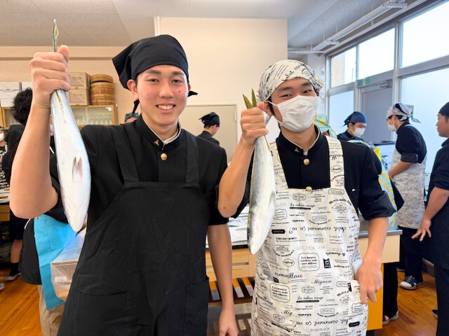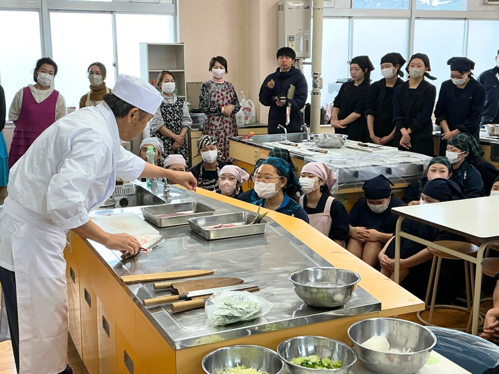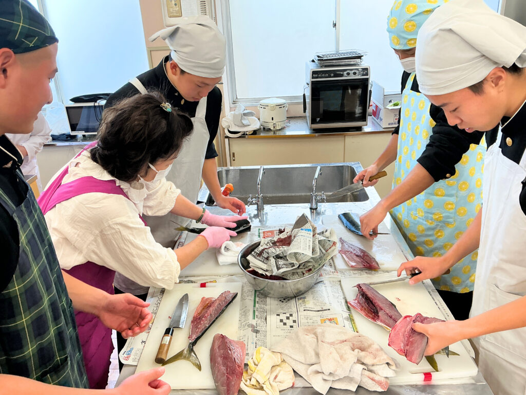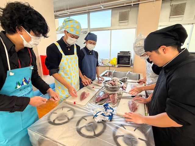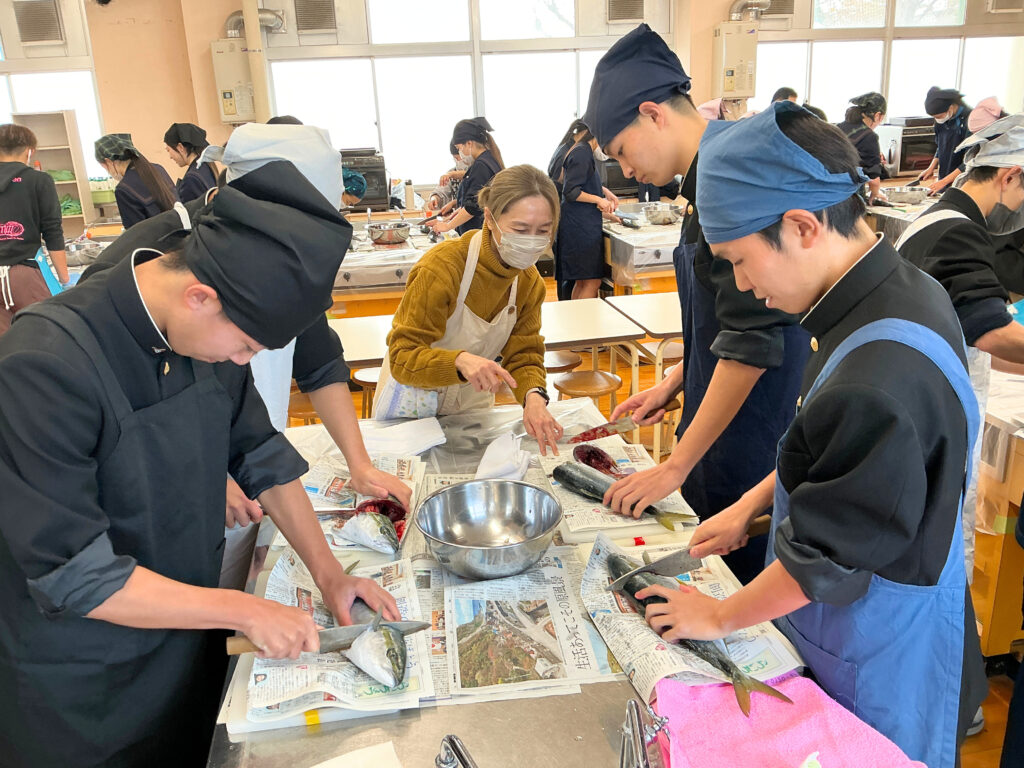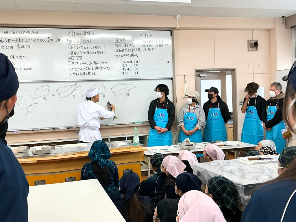 富山県漁業協同組合連合会、新湊漁協青年部・女性部より12名の講師を迎え、地元でとれたフクラギを3枚おろしにしたり、ざんを用いた汁物を作ったりしました。